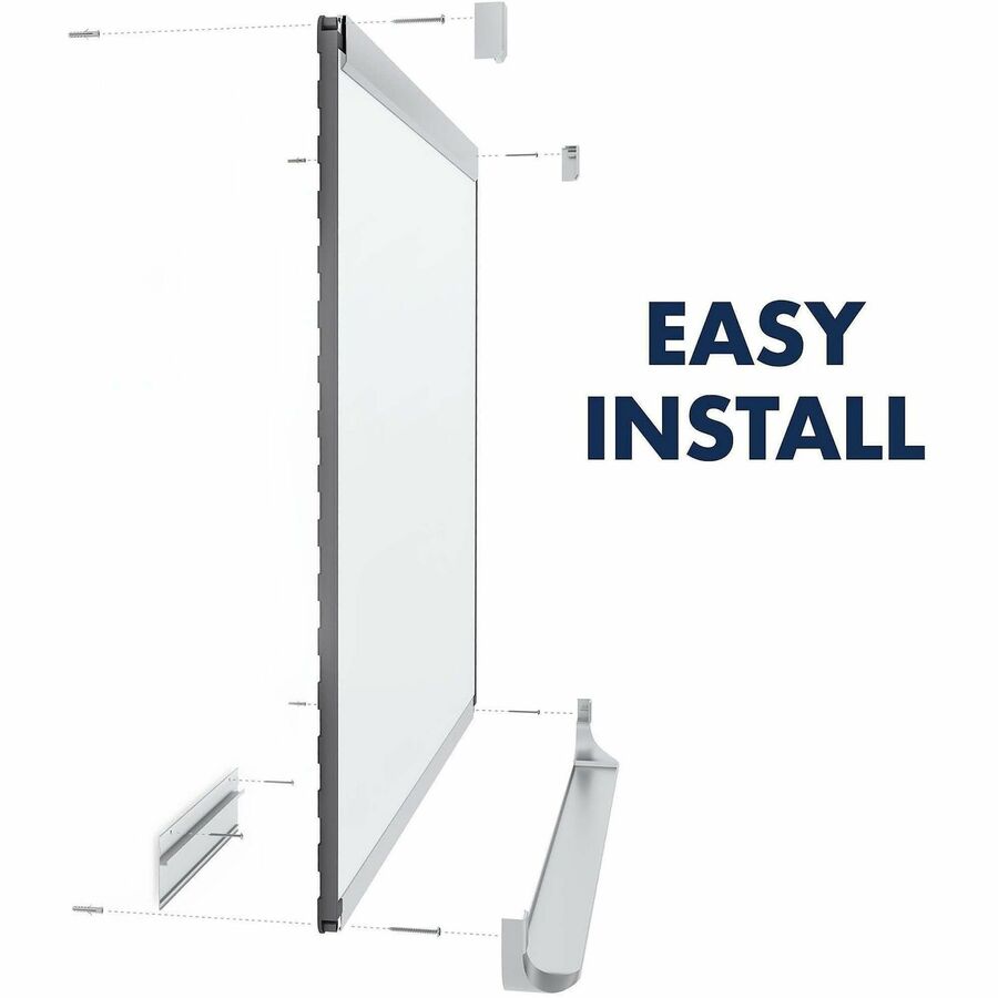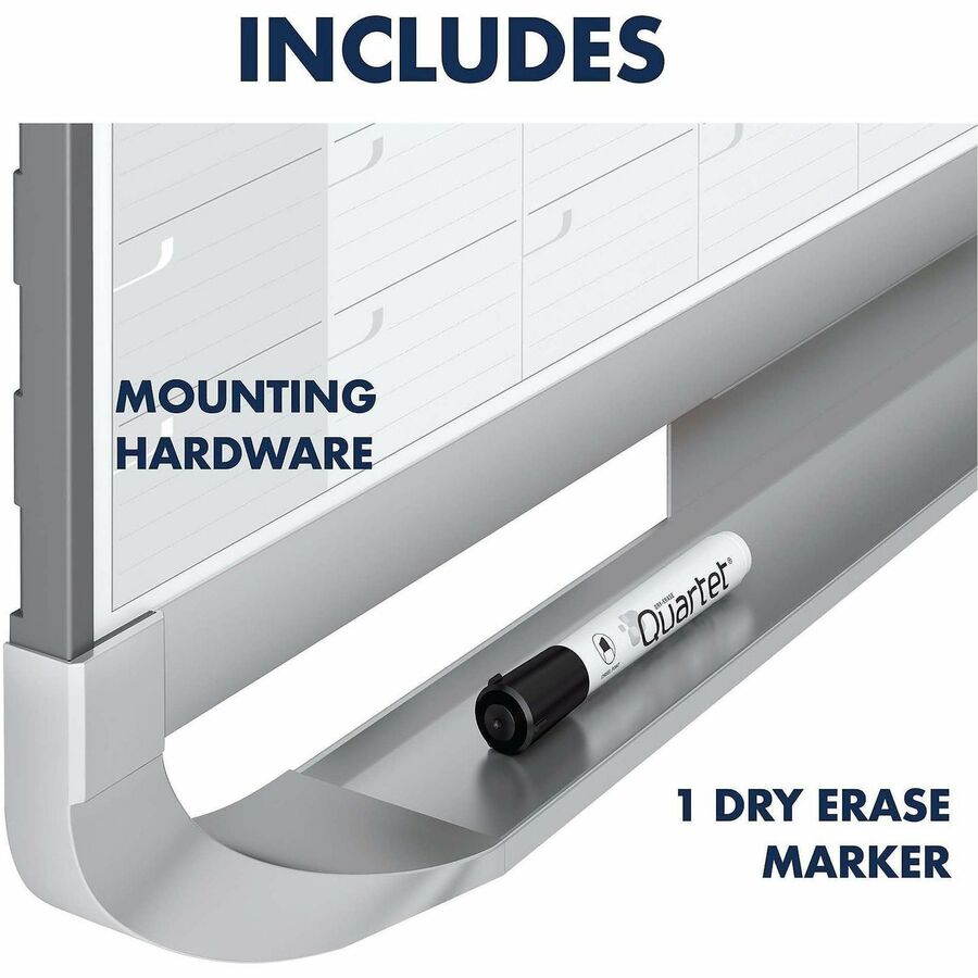 | Product Description | Keep important project dates highly visible with the Prestige Total Erase Monthly Calendar. Ideal for hard walls in frequently used group or personnel environments. Total Erase surface will not stain or ghost and resists dents and scratches, allowing new months to begin with a clean slate. Effectively display information in the generous notes area and date entry space. Undated calendar offers seven columns labeled Sunday through Saturday with the weekends shaded. Patented "Easy Mount" hanging system ensures simple and accurate installation. Calendar includes an attachable marker tray and one Quartet dry-erase marker. Contemporary, graphite finish frame makes a bold impact. |