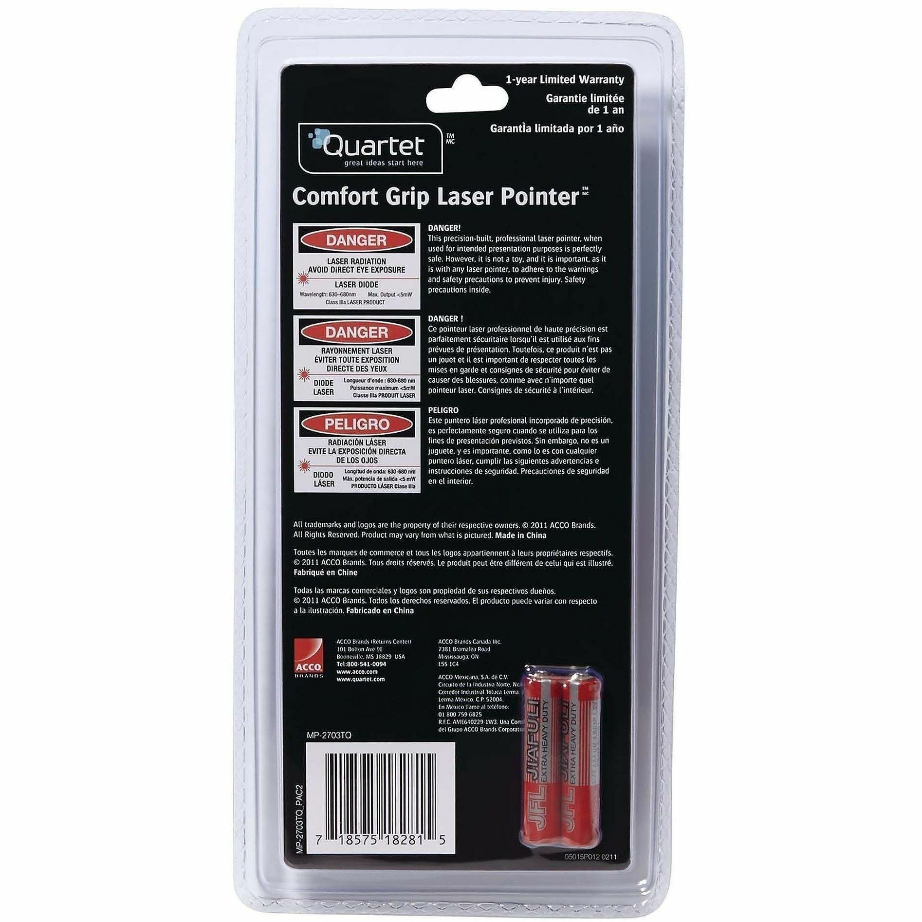 | Product Description | Pen-style laser pointer is enhanced with a nonslip, rubberized cushion grip for more comfortable use. Class 3a laser pointer projects a highly visible red dot over 300 yards. Bright red dot can be used on any medium, including high lumen overheads, videos and multimedia projections. Battery-operated design runs on two AAA batteries (included). |