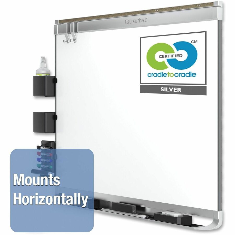 | Product Description | Prestige 2 DuraMax porcelain board features Quartet's most durable writing surface. Exceptionally resilient and smooth, the porcelain surface will not ghost, stain, scratch or dent over time despite years of heavy use. The surface of this whiteboard is also magnetic so that it can double as a magnetic bulletin board. With a stylish aluminum frame and attached marker tray, this top-of-the-line board is a useful addition to any office space. Hang board quickly and easily on any wall using the included pass-through mounting hardware. Sleek, silver-colored frame complements any office environment and is made of aluminum. Whiteboard also features a full-length marker tray that is specially designed to securely hold accessories. Prestige Connects accessories (sold separately) quickly and easily attach to the specialized frame to provide convenient access to board essentials. Minimal cleaning of board surface is recommended. Board includes four Quartet dry-erase markers with chisel tips. |