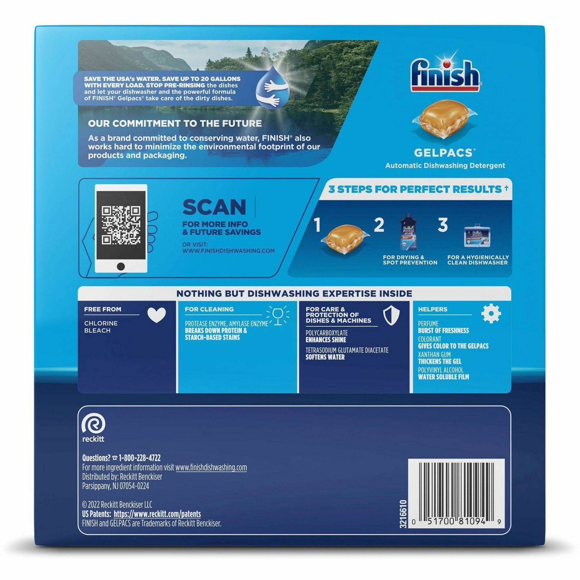 | Product Description | Dishwasher detergent tackles tough messes with revolutionary pre-soakers that burst into action to scrub away tough food residues. Powerful cleaners remove even the toughest stains and gently scrub your dishes and glasses to create a sparkling shine. Easy-to-use gelpacs eliminate the need to measure for quick, simple cleanings. Detergent is designed for use in automatic dishwashing machines. |