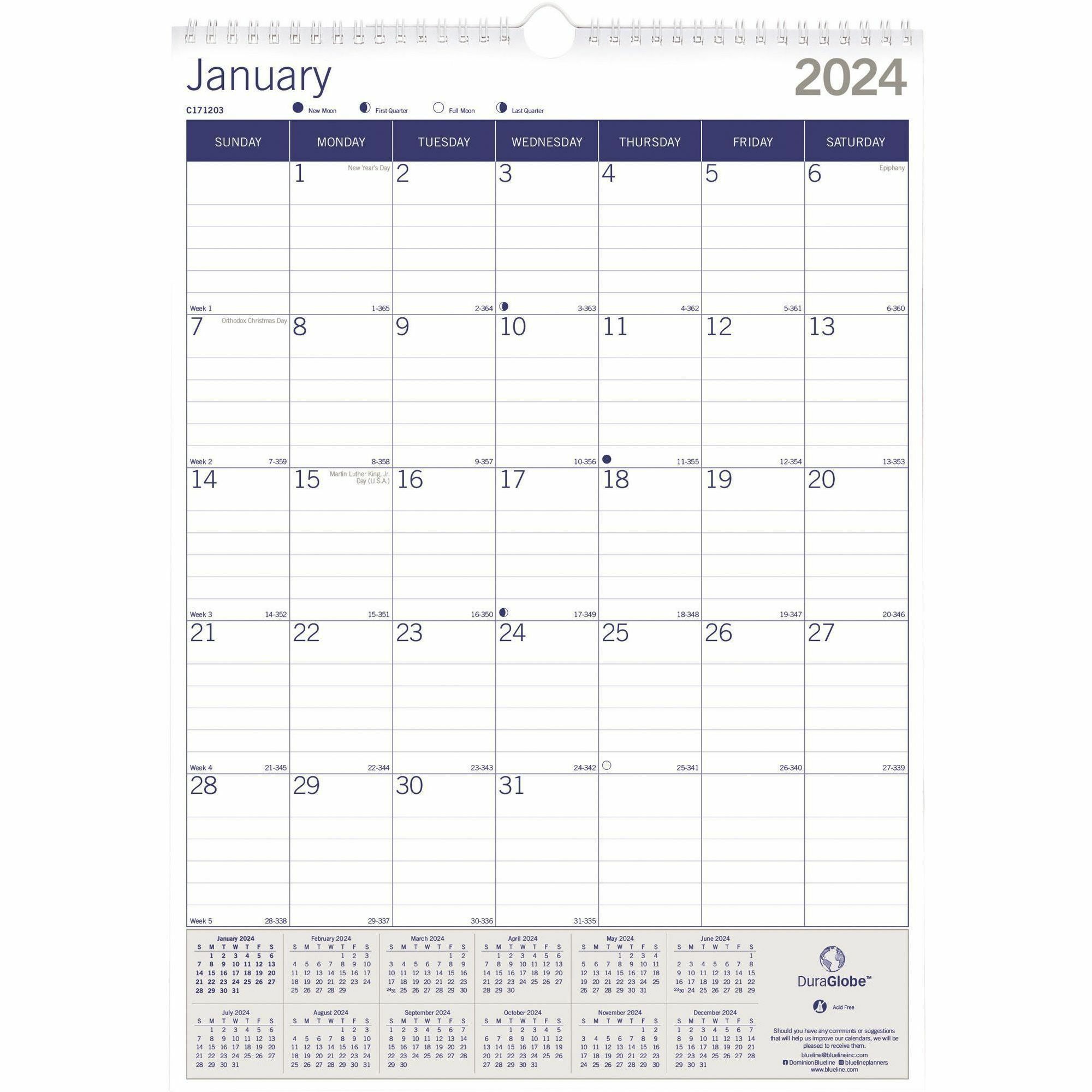 Organize your monthly schedule with this environmentally friendly, monthly wall calendar. Calendar's recyclable paper is produced primarily from sugarcane fiber instead of wood fiber, through a sustainable, eco-friendly manufacturing process that saves trees, water, oil, electricity and produces less greenhouse gasses. One-page-per-day format includes ruled daily blocks, Sunday-through-Saturday scheduling, ruled notes section, moon phases, holidays and a full-year calendar reference along the bottom. The current reference month is shaded for quick identification. DuraGlobe Monthly Wall Calendar also includes a reinforced chipboard backer for a sturdy writing surface. |