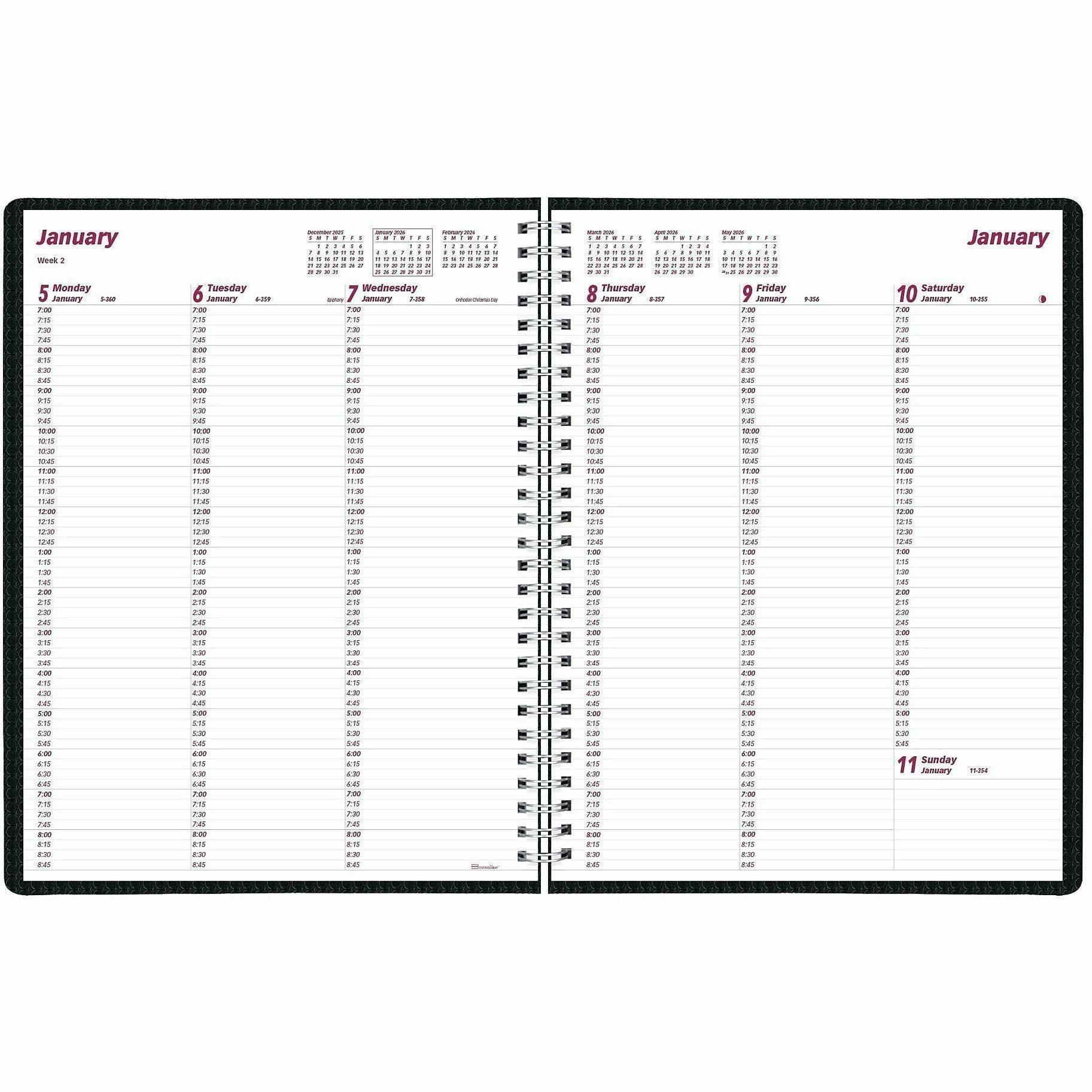 Julian Dates - Weekly - 12 Month - January 2026 to December 2026 - 7:00 AM to 8:45 PM - Quarter-hourly, 7:00 AM to 5:45 PM - Quarter-hourly - 1 Week Single Page Layout - 11" x 8 1/2" Sheet Size - Twin Wire - Black - Poly - Heavy Duty, Textured Cover, Appointment Schedule, Address Directory, Phone Directory, Reference Calendar, Flexible Cover - 1 Each