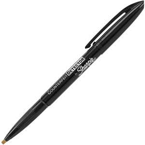 Counterfeit Detector by Sharpie is specially formulated to detect bad bills. The technology reacts to the presence of a key ingredient present in papers that are not used by the U.S. Treasury. The ink marked on a suspect, counterfeit bill will change in color from golden brown to blue-black. An authentic bill will not produce an ink color change. This marker is effective on all U.S. currency. |