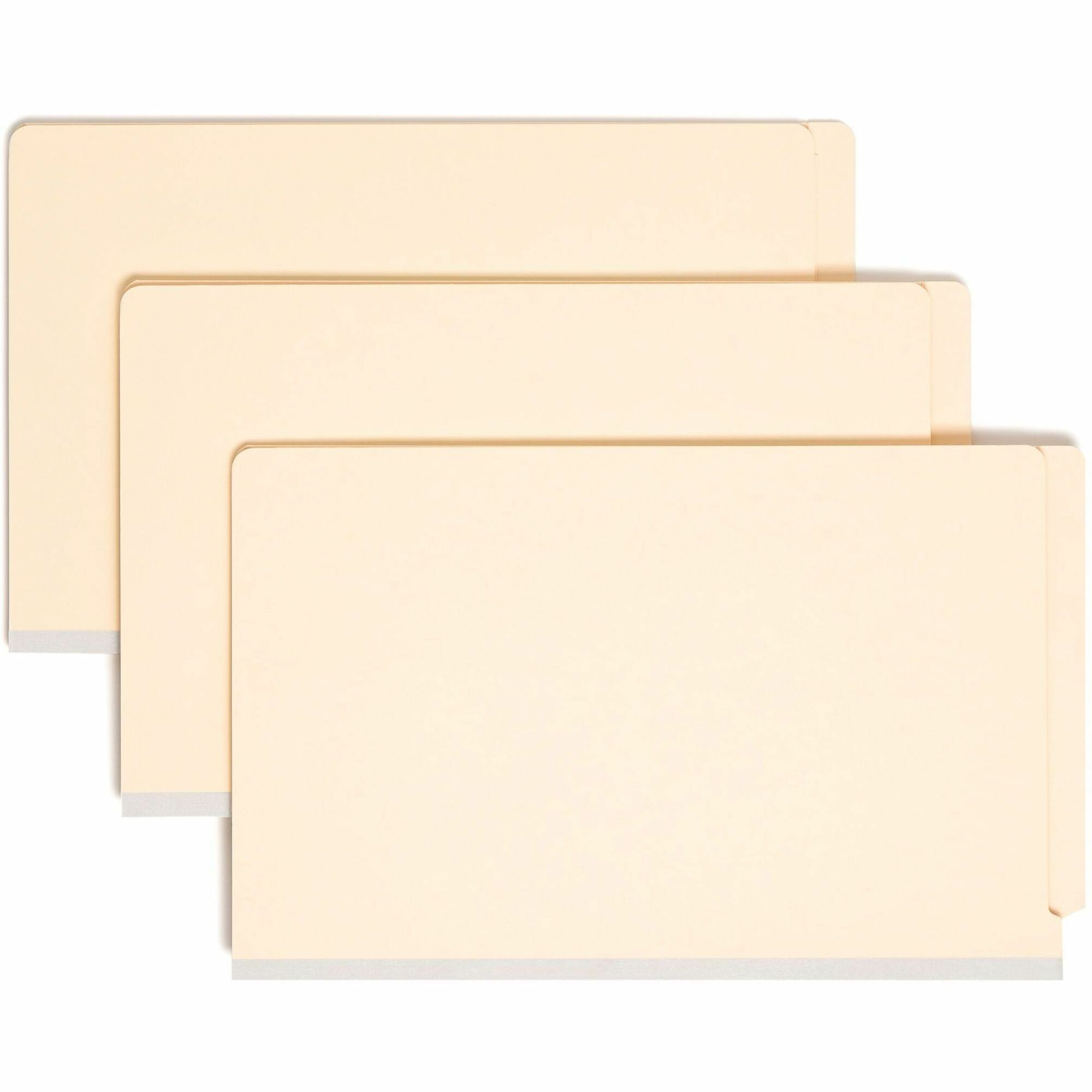 | Product Description | End-tab classification folders make ideal project files because they allow you to create subdivisions of material within one folder. Straight-cut tab offers plenty of labeling space. Fasteners on the front and back panels and the two dividers create separate filing surfaces. Two 2" prong B-style fasteners are in positions No. 1 and 3. Folders are made of 18 point stock. Dividers are made of 18 point stock. 1/3-cut tabs on dividers are 3/8" high. Dividers are fully taped to the gusset. Both sides of each divider have 1" prong fasteners. Legal-size folders expand 2". |