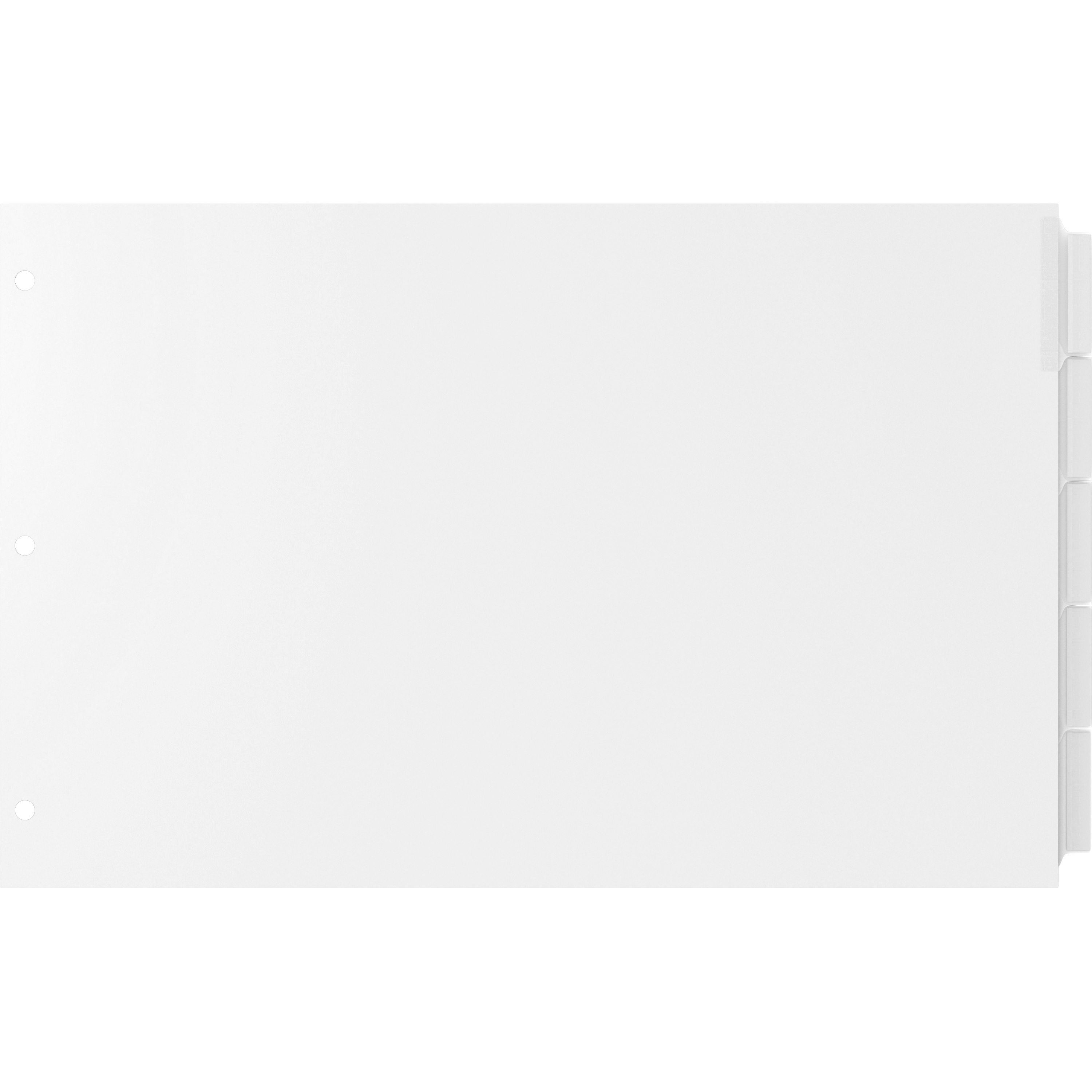 | Product Description | Insertable index dividers are designed for use in ledger-size binders (11" x 17") in landscape orientation. Binding edge is three-hole punched and reinforced for durability. Set of five with clear tabs includes blank white inserts. |