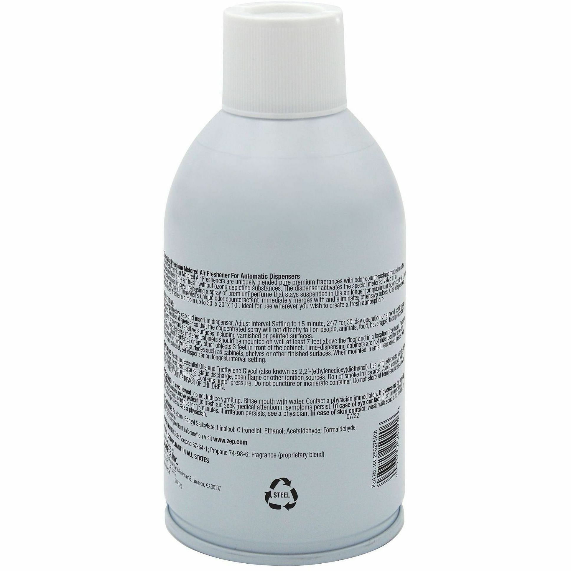| Product Description | Elevate your customer or visitor experience with this innovative, Premium Metered 30-Day Air Freshener - Clean and Fresh. Perfect for your odor control program, fragrance and odor counteractants in one can neutralize stubborn odors swiftly and provide lasting aromatherapy from the high-quality fragrance made with essential oils. Dual actuator system creates small micron dispersion, eliminating fallout. High fragrance load percentage ensures longest-lasting experience. As air flows through the cotton sheets swaying back and forth in the springtime, a warm breeze carries the simple yet defining scent of fresh cleaned linens. Dual odor counteractants target specific malodor-causing particles. Use this refill in TimeMist full-sized, metered fragrance dispensers (not included) for 30 days of continuous use when set at 15-minute intervals. |