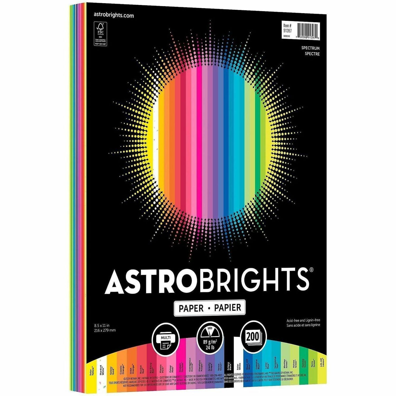 | Product Description | Astrobrights Paper in this 25-color set grabs your attention and makes a bold statement so it is the perfect choice for direct mail, announcements, invitations and bulletin boards. Bold, deeply saturated colors make your creations brighter and more fun. Acid-free, lignin-free, 24 lb. paper with a smooth finish runs well in laser printers, inkjet printers and copiers. It works well with black and dark pigment inks. It performs amazingly well with a variety of print techniques, unique folds, die-cuts and other paper combinations. Spectrum colors include Lift-Off Lemon, Solar Yellow, Galaxy Gold, Cosmic Orange, Solar White, Pulsar Pink, Plasma Pink, Rocket Red, Re-Entry Red, Orbit Orange, Fireball Fuchsia, Outrageous Orchid, Planetary Purple, Gravity Grape, Venus Violet, Gamma Green, Terrestrial Teal, Lunar Blue, Celestial Blue, Blast-Off Blue, Martian Green, Terra Green, Vulcan Green, Stardust White and Eclipse Black. |